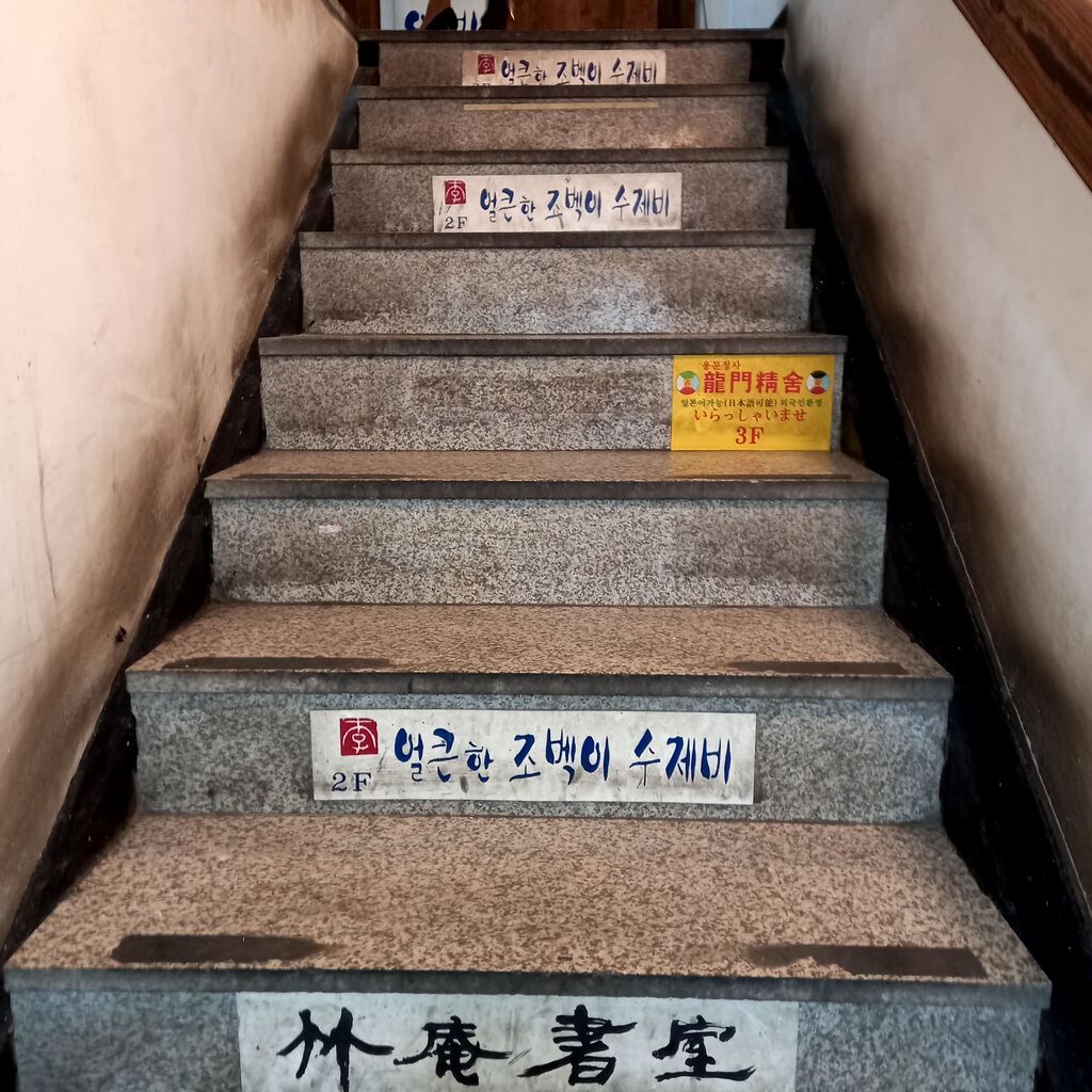 テレビ番組「水曜美食会」のロゴが大きく書いてあるのでビルはすぐわかるのですが、入口が分かりずらいこのビルの右側面に二階に上がる階段があります