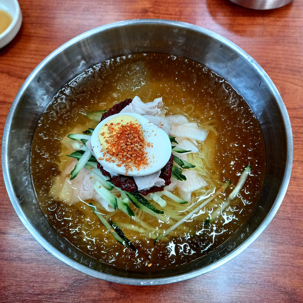 スープは、ソウルの冷麺のトンチミスープと違って、しっかりお肉味