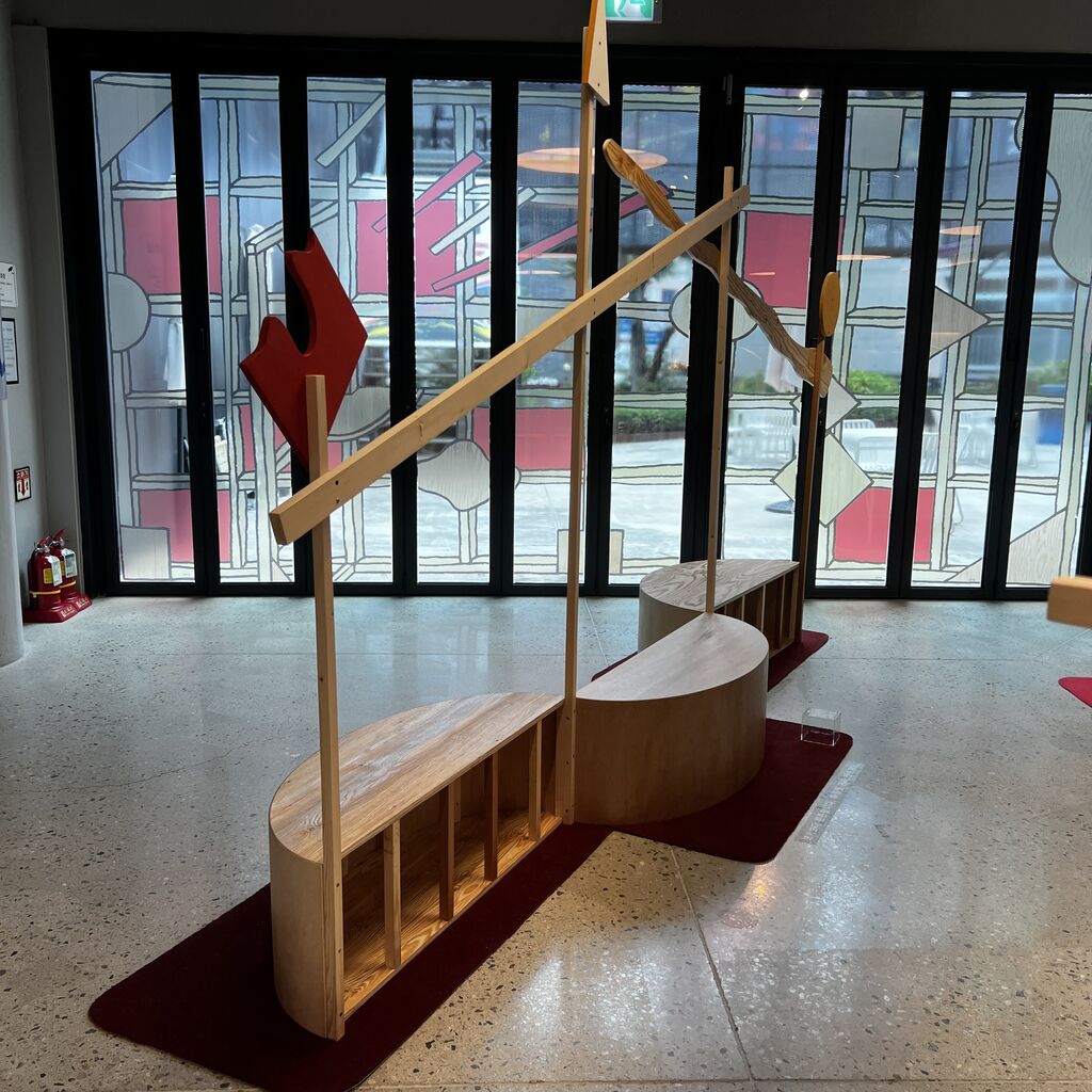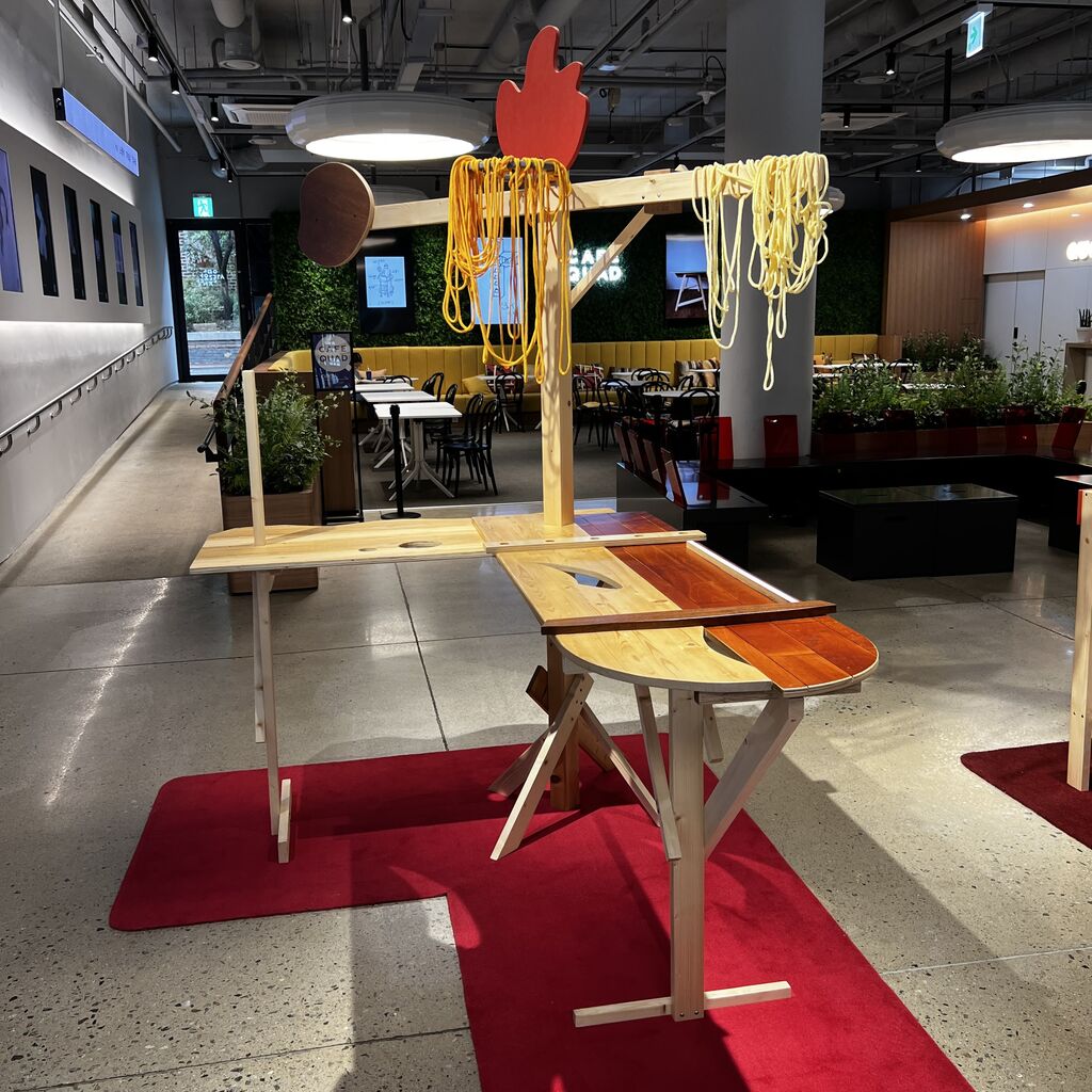 演劇が終わった後、舞台の主人公になったセットがコンセプトで、私たちが休憩できるようになっています。