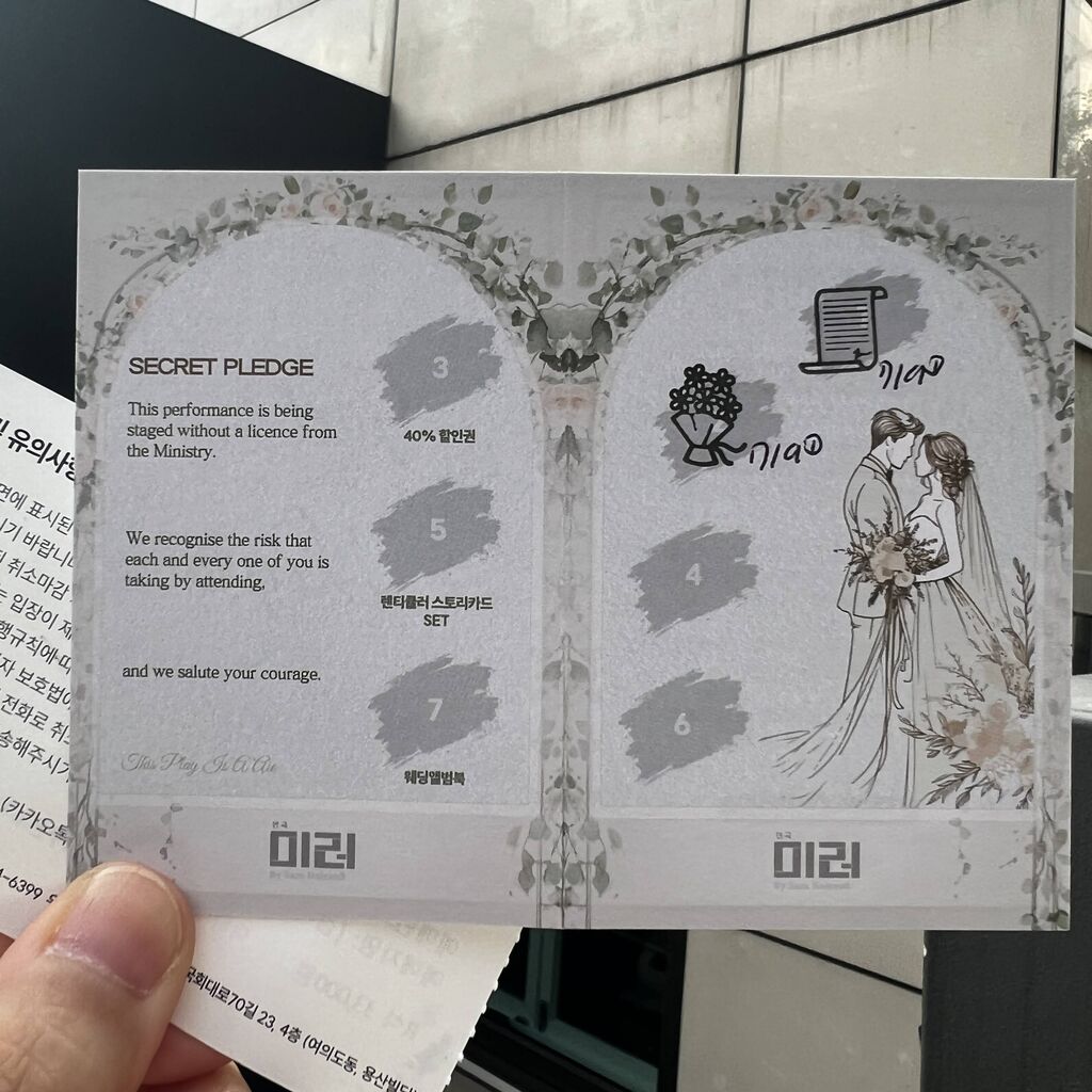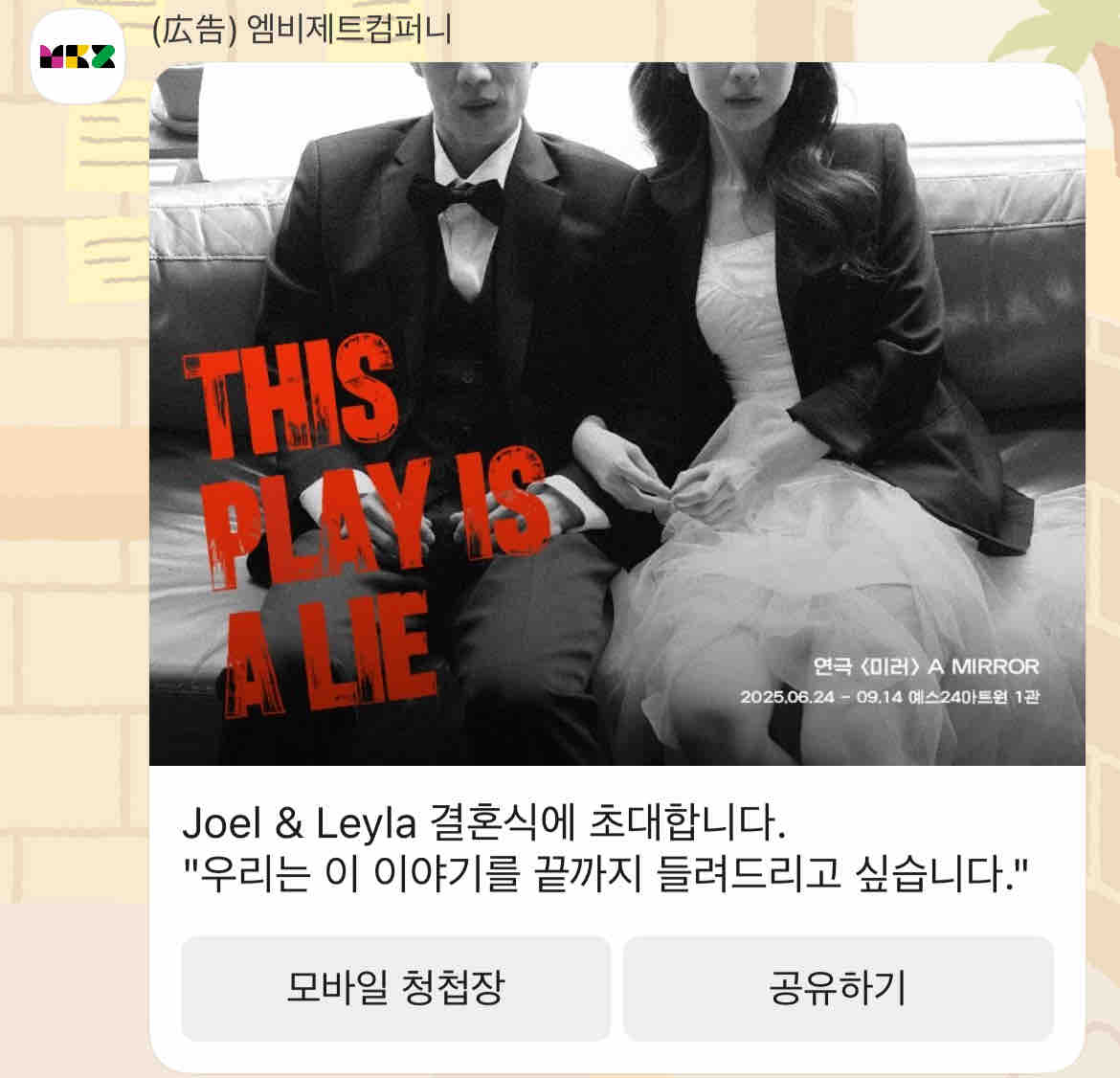 私は、制作会社のmbzカンパニーのカカオトークアカウントをフォローしているんだけど、突然結婚式の招待状が届いて👇「なになに?!どういう演劇?!」って思ってて、しかも「LIE」って。