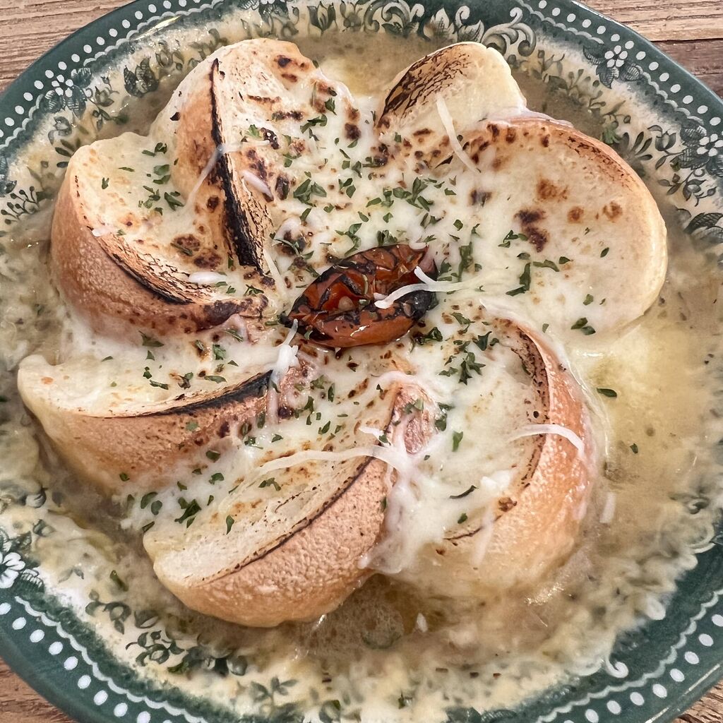 アイスアメリカーノ、オニオンスープ、塩パン